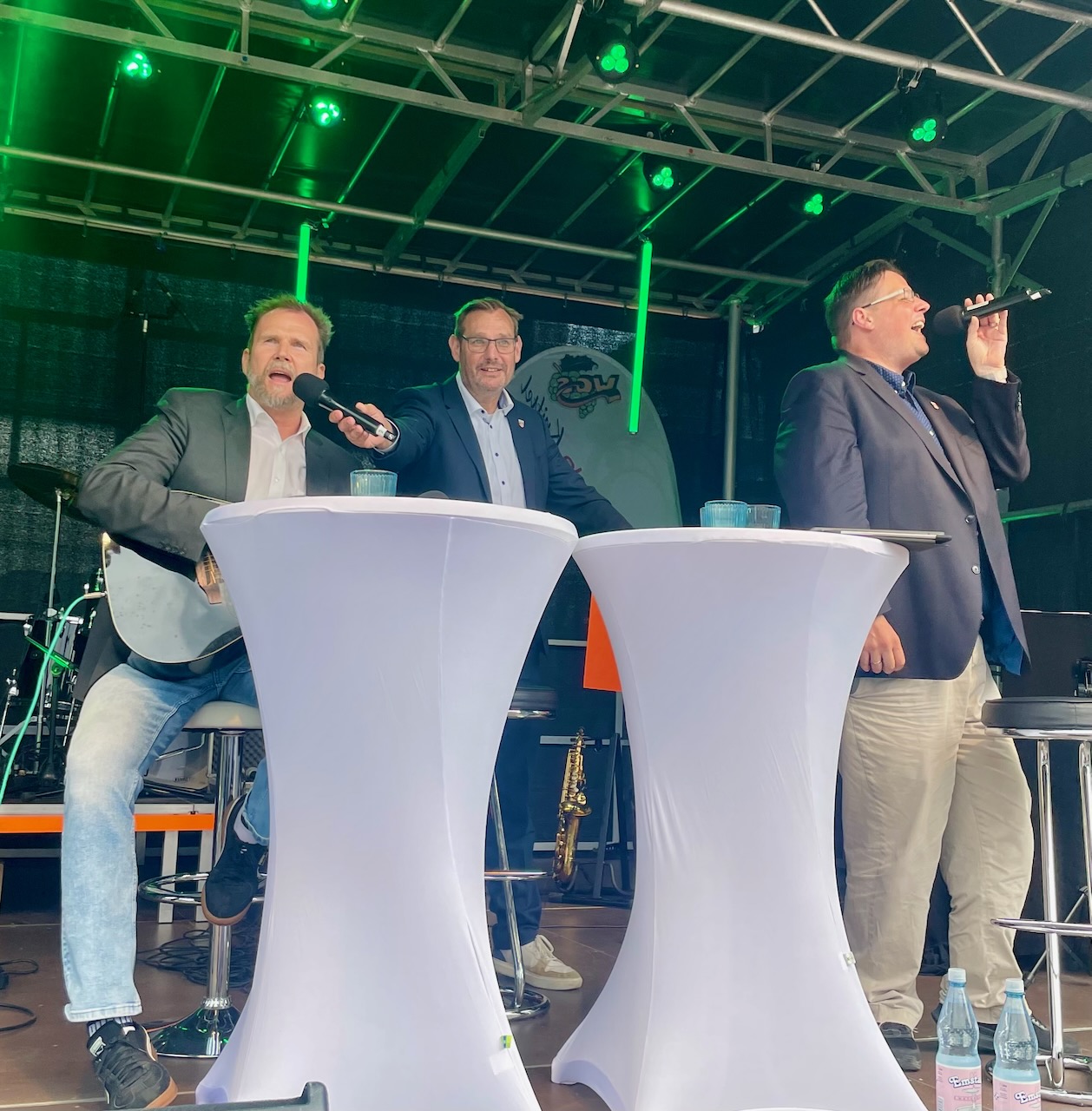Die Gesprächsrunde mit Axel Wintermeyer, Christian Seitz, Pasquale Fiore (ehemaliger Schüler und jetziger Karnevalspräsident) und Dr. Richter brachte viele Anekdoten zutage: vom Aufsatz ohne Satzzeichen über gebrannten Schnaps im Chemieunterricht bis zur legendären Pause am Rossert-Imbiss. Bei so viel Nostalgie griff Dr. Richter schließlich selbst zur Gitarre – gemeinsam wurde Knockin’ on Heaven’s Door gesungen.