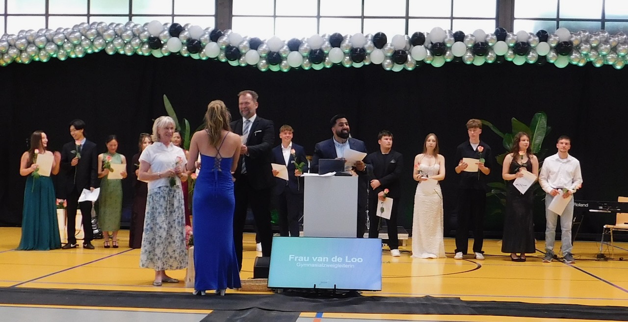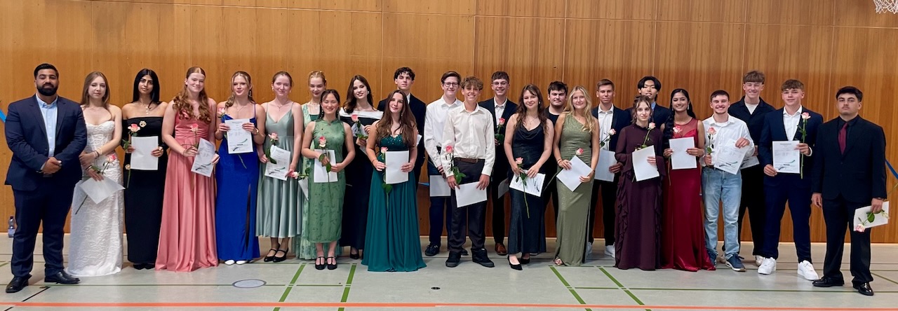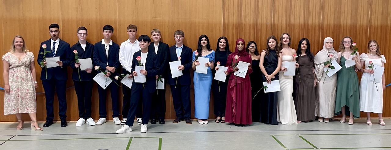 Diese Fragen stellten sich so manche Lehrkräfte beim Anblick der Verwandlung, die unsere Schülerinnen und Schüler am Freitag, den 27. Juni, durchlaufen hatten. Statt des gewohnten Alltagslooks präsentierten sich die Jugendlichen in eleganter Abendgarderobe: Die jungen Frauen trugen fast durchweg vom Catwalk inspirierte Outfits und setzten mit leichten, fließenden Kleidern in zarten Pastelltönen sommerlich-festliche Akzente. Die meisten jungen Männer erschienen selbstbewusst in schwarzen Anzügen – wie wandelnde Ausrufezeichen ihrer eigenen Entwicklung.