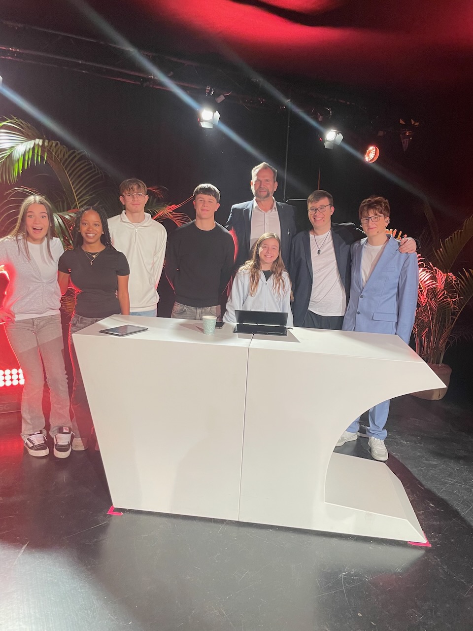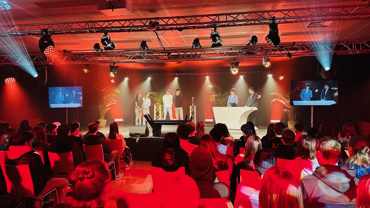 Unsere Aula wirkt an diesem Tag wie ein TV-Studio mit allem Pipapo. Professionelles Licht, große Bildschirme, Monitore, Einspieler, Werbepausen, Jingle. – und natürlich der rote Buzzer. Zwei Schüler mit Live-Cam bewegen sich durch die Menge, fangen Atmosphäre, Kreischen, Jubel ein. Die Showmaschine läuft wie geschmiert. Offensichtlich wurde an nichts gespart.